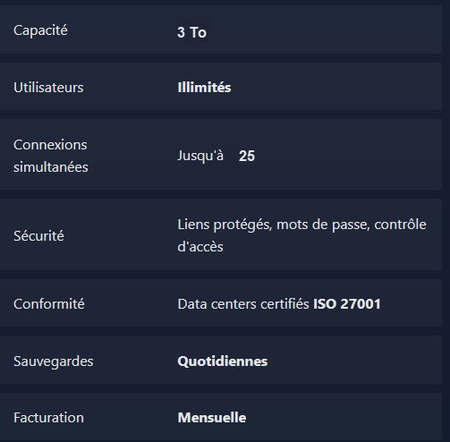 Liens protégés par mot de passe Datacenters certifiés ISO 27001 Sauvegardes quotidiennes Facturation mensuelle